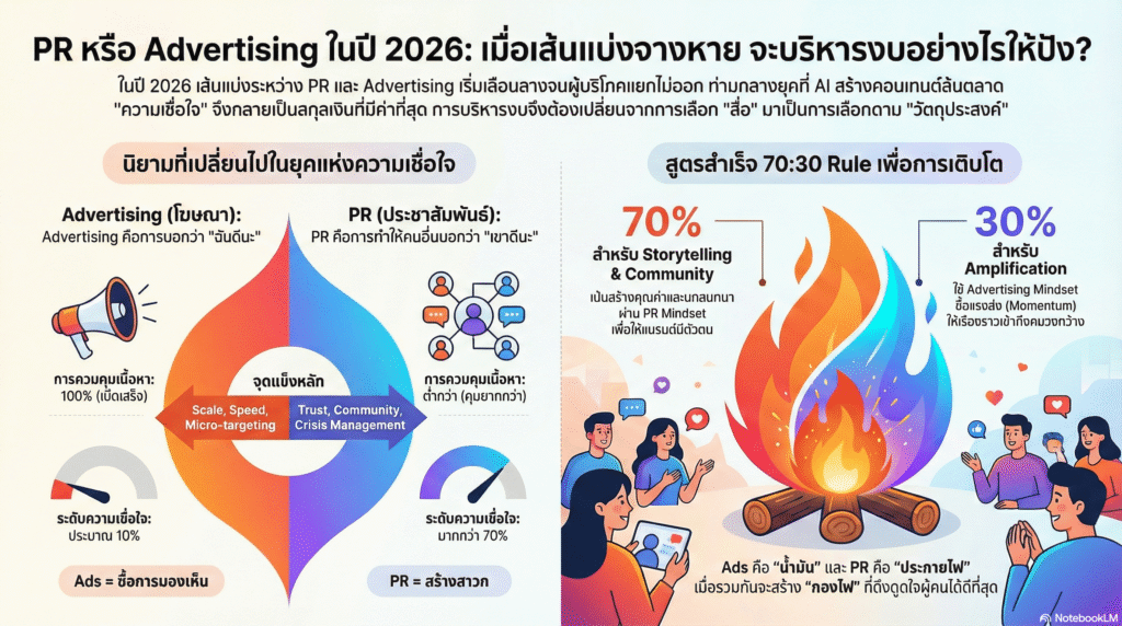 ในปี 2026 คำว่าเส้นแบ่งจางหายดูจะไม่ใช่แค่คำสวยๆ เมื่อมันกลายเป็นเรื่องจริงที่เจ็บปวดเพราะวันนี้ PR เริ่มทำตัวเหมือน Ads ที่พากันซื้อ Boost โพสต์รัวๆ และ Ads ก็พยายามทำตัวให้เนียนเหมือน PR เองอีกด้วย ผ่านการจ้าง Influencer ทำรีวิวเหมือนไม่ได้จ้าง